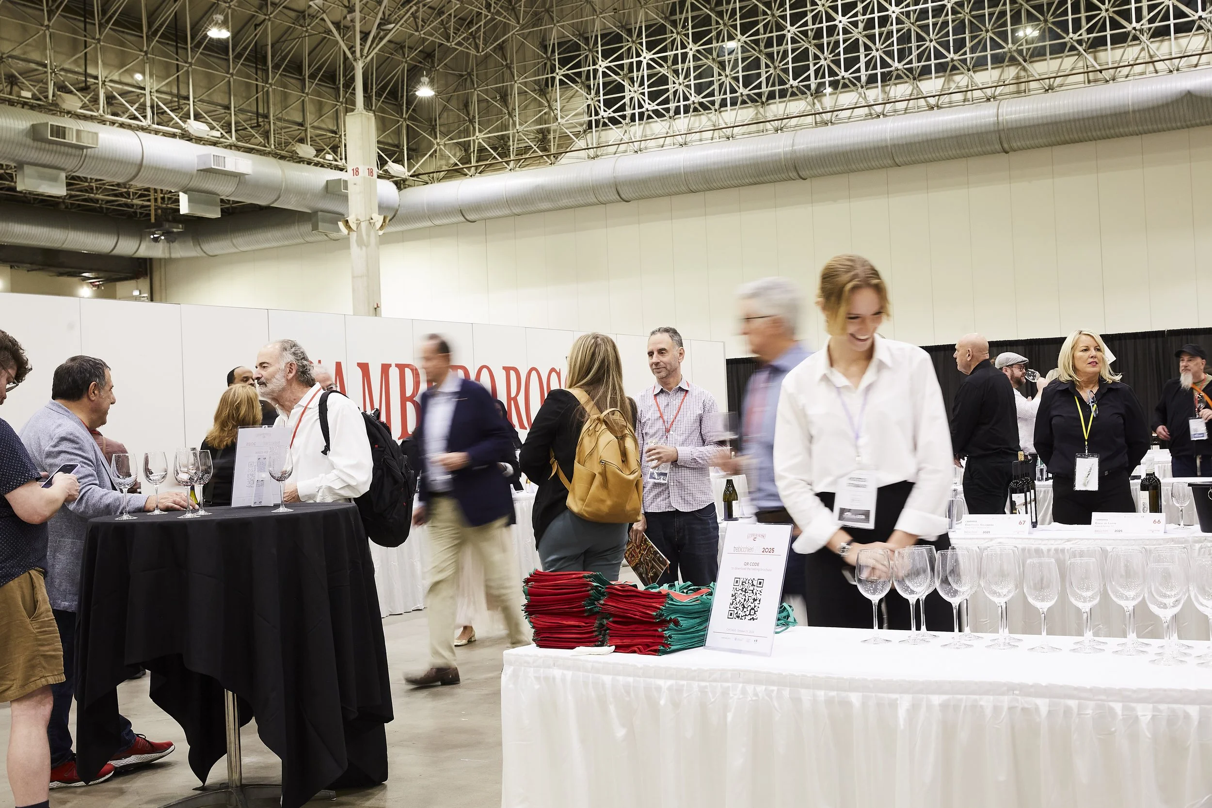 People attending a wine tasting event in a large exhibition hall, with tables set up with wine glasses and promotional materials.
